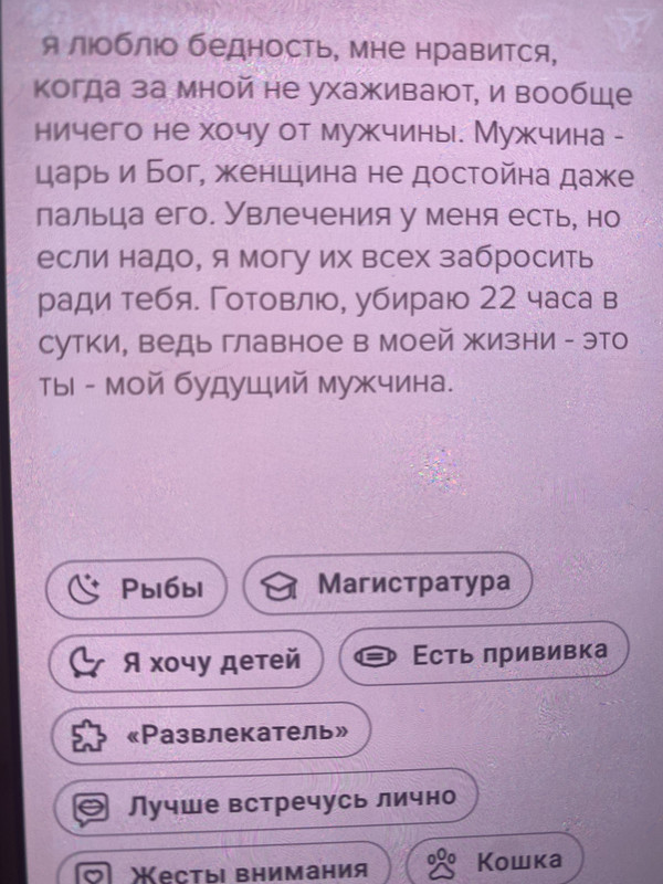 Мне лайки сегодня летят) Что не анкета то клад, даже не знаю кого выбрать😄Представляю вашему вниманию) Разочарованную Анастасию которая ищет себе лантуха с печальной самооценкой чтоб ездить у него на шее, так как от прошлых двух мужей получила пинка под зад. Ну и конечно она любит мужчин именно в военной форме. Да неееет, вы что? Как вы могли подумать что дело в деньгах.Просто форма очень красивая)))